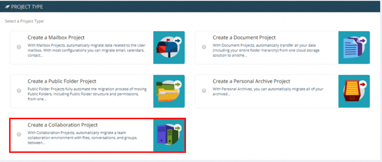 Teams migration projects will follow the same simple setup process as other workloads in MigrationWiz. For Teams projects, a new project option has been created: “Create a Collaboration Project.” This will now be presented alongside mailbox, document, archive, and public folder options in the “Create a Project” window.