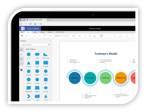 Visio Online lets you create, edit, and share basic diagrams in your favorite browser. Starting is easy with modern UI and intuitive Getting Started experience. Ready-made templates are designed to meet needs of various audiences. Collaborate with your team to create visuals by getting comments from others – diagrams are stored securely in OneDrive storage provided. When the diagram is complete, share it with everyone in the organization, even if they do not have a license.